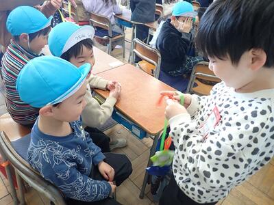 1年生たちは一つ下の年長さんたちの手を引いて誘導したり、一緒に遊んだり、手作りの折り紙のプレゼントを渡したり。