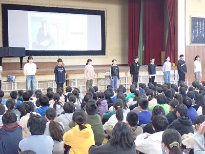 児童朝会で委員会活動報告を行いました。