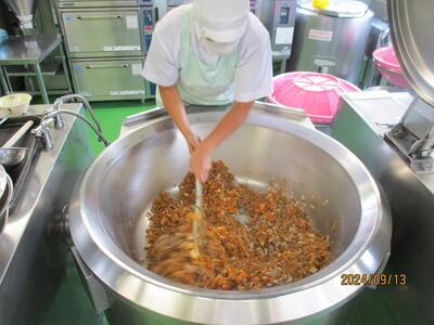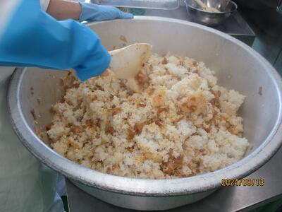 たくあん、キムチを合わせて具を作り、ご飯と混ぜます。