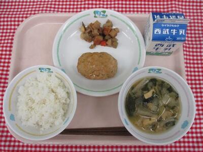 ご飯 牛乳 鶏つくね 五目煮 大根と小松菜の味噌汁