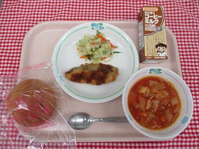 子供パン コーヒーミルク ホキフライ キャベツのレモン和え ミネストローネ