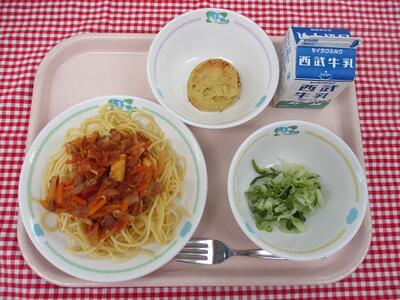イカとトマトのスパゲティ 牛乳 グリーンサラダ スイートポテト