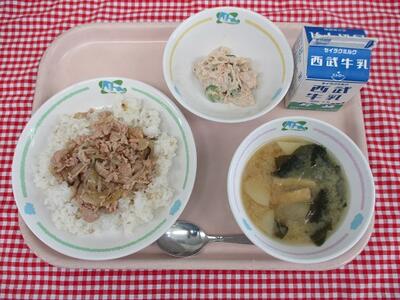 麦ご飯 牛乳 豚丼 蓮根のマヨネーズ和え じゃがいもとわかめの味噌汁