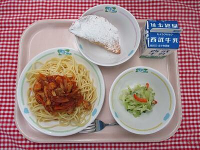 イカとあさりのスパゲティ 牛乳 フレンチサラダ スィートポテトパイ