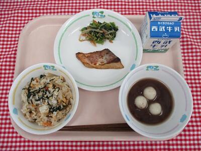 五目寿司 牛乳 鰤の照り焼き 小松菜の胡麻和え お汁粉