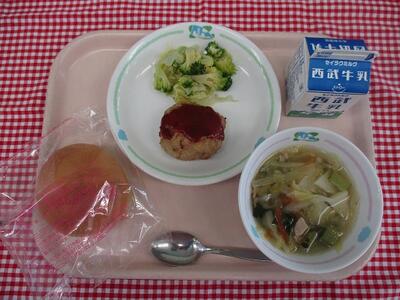 子供パンスライス 牛乳 ハンバーグ ブロッコリーとキャベツのサラダ コンソメスープ