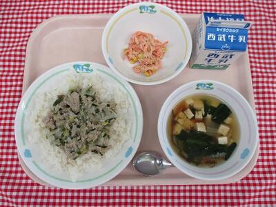 塩豚丼 牛乳 人参の胡麻マヨサラダ 豆腐ともずくのスープ