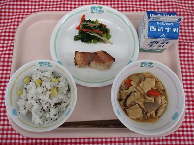 さつまいもご飯 牛乳 メヌケの西京焼き 小松菜の磯和え 高野豆腐のうま煮