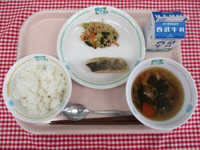 わかめご飯 牛乳 鮭のマヨネーズ焼き 切り干し大根の炒め煮 豆腐と小松菜の味噌汁