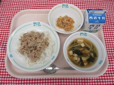 麦ご飯 牛乳 豚丼 切り干し大根のサラダ 豆腐の澄まし汁