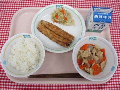 ご飯 牛乳 サンマの蒲揚げ キャベツの塩昆布和え 高野豆腐のうま煮