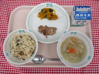 青菜ピラフ 牛乳 鶏肉のハーブ焼き かぼちゃサラダ ABCスープ