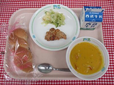 ツイストパン 牛乳 鶏肉のハニーマスタード キャベツとりんごのサラダ パンプキンポタージュ