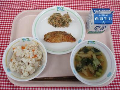 里芋ご飯 牛乳 ホキの胡麻風味揚げ 卯の花の炒り煮 大根と小松菜の味噌汁