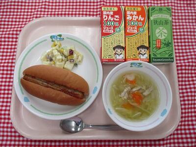 ホットドック(コッペパンスライス、ウィンナー) セレクトジュース(りんご、みかん、お茶) さつまいもサラダ ABCスープ