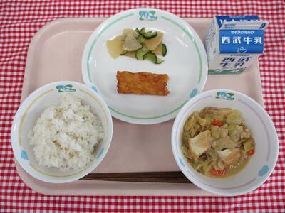 ココア揚げパン 牛乳 鶏肉の塩焼き ほうれん草サラダ キャロットポタージュ