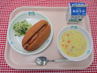 コッペパンスライス 牛乳 ホットドッグ(ウインナー) グリーンサラダ コーンチャウダー