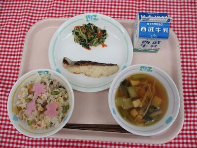 さくらちらしずし 牛乳 さわらのさいきょうやき ほうれんそうのごまあえ とうふのすましじる