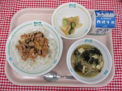 むぎごはん 牛乳 ぶたキムチどん かぶときゅうりのオイルづけ わかめスープ